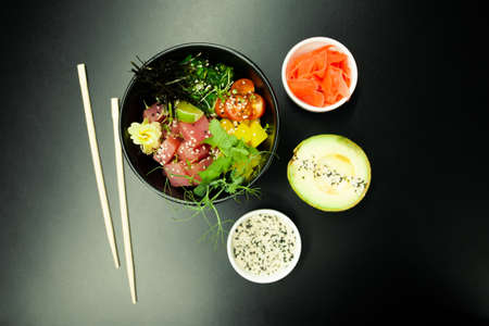 Poke salad with tuna in a bowl. Ingredients fresh tuna, cherry tomatoes, marinated seaweed, rice, takuan, Ponzu sauce, Teriyaki sauce, nori, sesame seeds, lime, cilantro. Asian seafood salad concept.