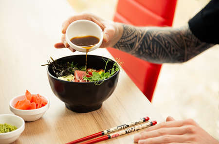 A man adds soy sauce to Poke salad. A man's hand pours soy sauce into a bowl of salad. Guy young man dressing salad with sauce in a restaurant or cafe.