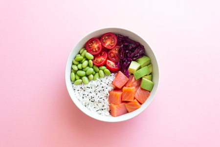 Poke bowl with rice, salmon, avocado, red cabbage, edamame and tomatoes. Healthy food. Diet