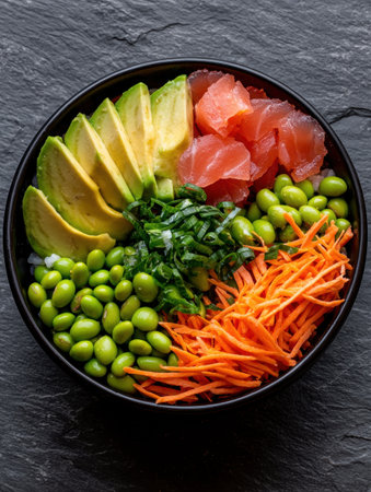 Delicious and healthy poke bowl with avocado, tuna, edamame, and carrots