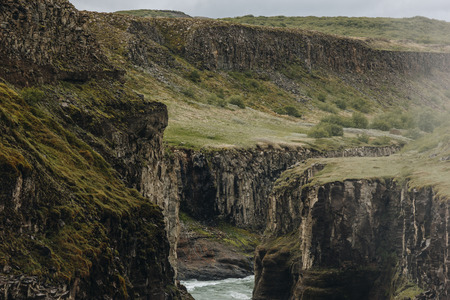fjadrargljufur canyon in iceland with blue water and cloudy sky. really beautiful canyon no people