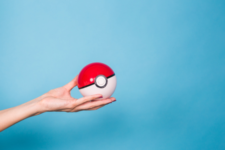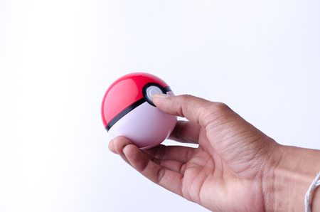 Thailand - August 20, 2016: Poke ball in Hand (Pokemon Ball). Pokeball toy of the game Pokemon Go at Chon Buri, Thailand.