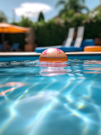Colorful inflatable ball floating in swimming pool on sunny summer day