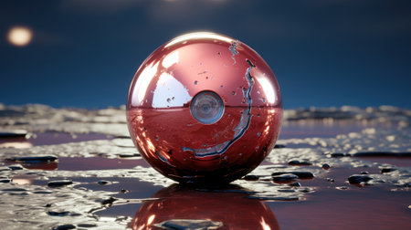 A vibrant red ball bounces and splashes through a puddle of water, creating ripples and droplets in its wake. The balls motion captures the energy and excitement of playtime. Generative AI