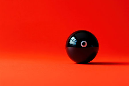 A vibrant black and white illustration of a sleek, round object set against a bold red background, emphasizing simplicity and modern design in an artistic concept