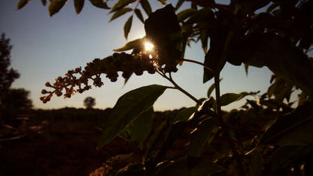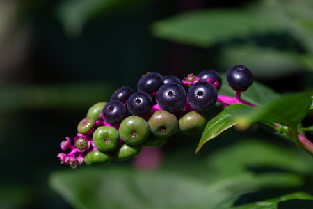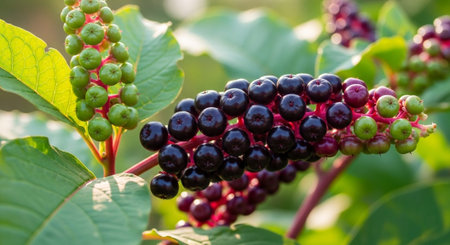 Small black poisonous fruits of Phytolacca plant, also known as pokebush, pokeberry, pokeroot or poke sallet and green leaves in a garden in a sunny autumn day, beautiful outdoor floral background