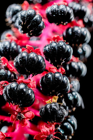 Close up of phytolacca acinosa, also known as Indian Pokeweed, Pokebush, Pokeberry, Pokerot or Pokesballet. Deep, dark purple berries. Phytolaccaceae family.