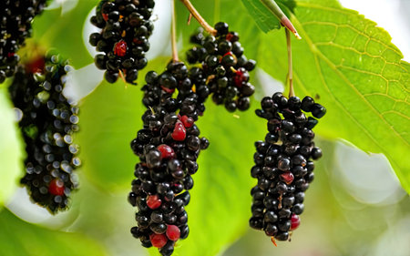 Close-up of black and red elderberry fruits growing on tree