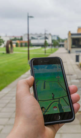 Estonia, Tallinn- JULY 23, 2016 : Walk with Pokemon Go game. Apple iPhone 6 in one hand showing its screen with Pokemon Go application.