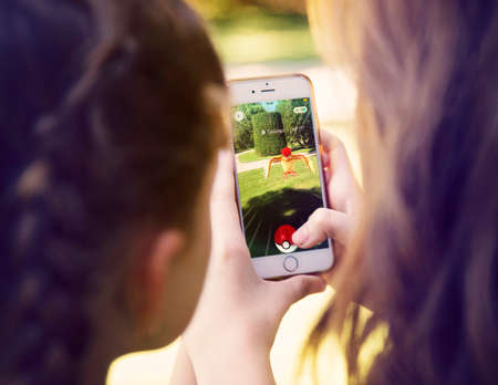 Vienna, AUSTRIA - August 1, 2016: Little girls playing a Pokemon Go game outdoors. Pokemon Go is a location-based augmented reality mobile game.