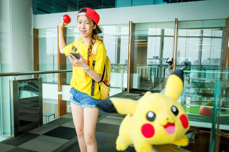 BANGKOK, THAILAND - September 3, 2016: Young woman playing Pokemon Go game on sky train. Pokemon Go is a free-to-play, location-based augmented reality game developed by Niantic.