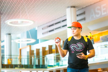 BANGKOK, THAILAND - August 14,2016: Trainer boy playing pokemon , pokemon ball playing at Gym Pokemon location ,Lighting with sun flare,