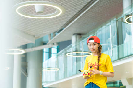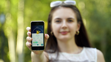 Samara, Russia - August 6, 2016: woman playing pokemon go on his iphone. pokemon go multiplayer game with elements of augmented reality. Catching the Pikachu pokemon.