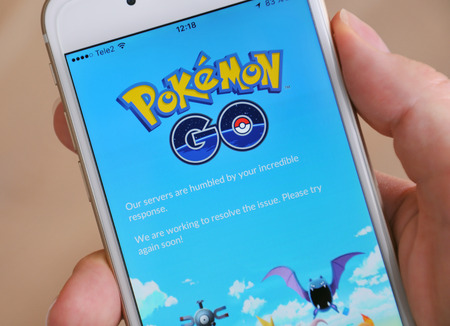 Tallinn, Estonia - July 18, 2016 Editorial image: Apple iPhone6 ??held in one hand showing its screen with Pokemon Go application error: our servers are humbled by your incredible response