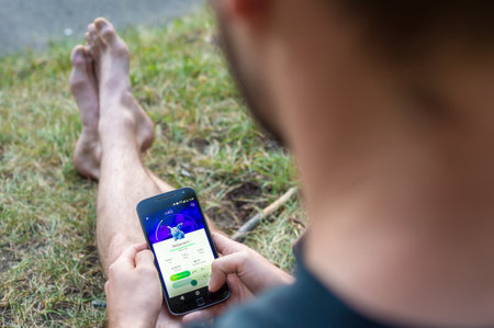 Montreal, CA - August 7, 2016: Closeup of a man playing Pokemon Go on a smart phone at sunset. Pokemon Go is a virtual reality game released in July 2016.