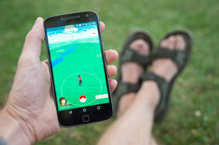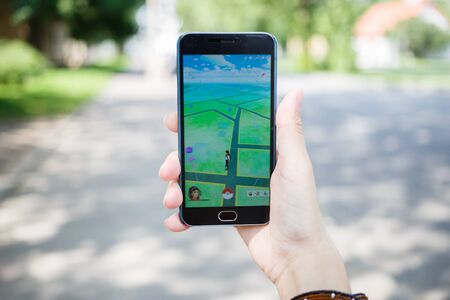 Moscow, Russia - August, 02: Android user play in Pokemon Go augmented reality mobile game on smartphone.
