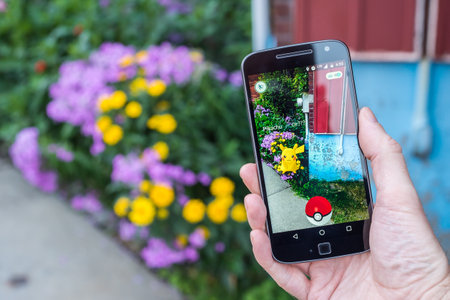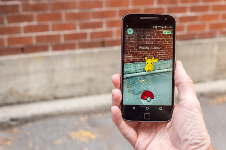 Montreal, CA - August 11, 2016: Closeup of a man playing Pokemon Go on a smart phone. Pokemon Go is a virtual reality game released in July 2016.