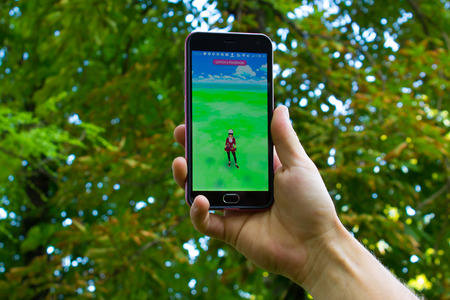 Montreal, CA - July 22, 2016: An Iphone user is playing Pokemon Go, a mobile game developed by Niantic