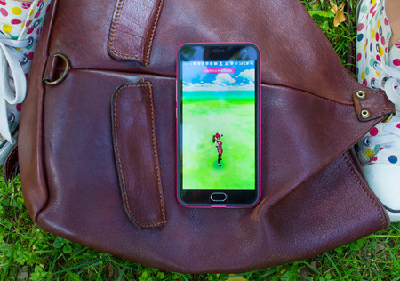 Bangkok, Thailand - August 27, 2016 : Pokemon Go application game on android mobile smartphone. Launched in Thailand on August 6, 2016 is very popular. But the problem of road accidents.