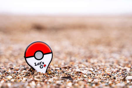 Budva, Montenegro March 07, 2020: new Pokemon Go Plus on the beach against the sea. Pokemon Go is a free to play augmented reality game developed by Niantic for iOS and Android devices.
