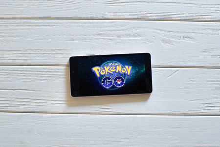 Vinnitsa, Ukraine. - August 12: Smartphone on a wooden board with Pokemon Go logo, August 12, 2016 in Vinnitsa, Ukraine