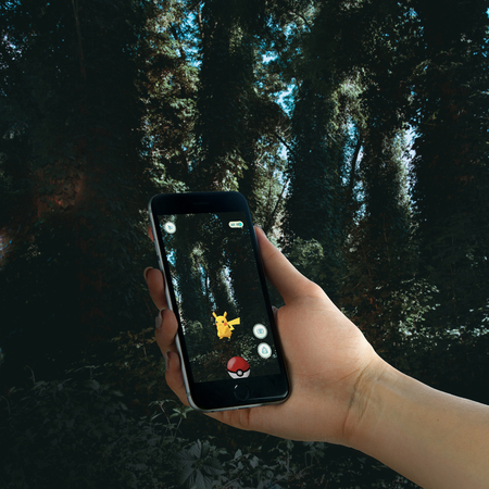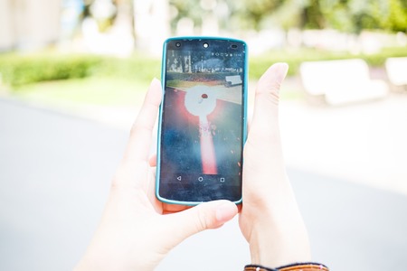 California, United States, July 2016 : Hand holding a cellphone to play Pokemon Go with blur background