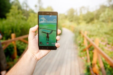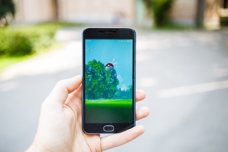 BATUMI, GEORGIA- JULY 14, 2016: Hand holding a smartphone to play the game of Augmented Reality Pokemon go