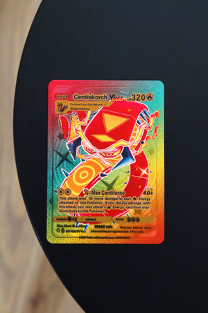 WARSAW, POLAND - AUGUST 18, 2023: Centiscorch Pokemon card used in collectible trading card game for children.