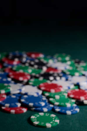 Stack of colorful casino gambling chips on green felt gaming table for exciting game night