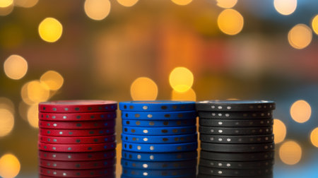 Stacks of Colorful Poker Chips on Reflective Surface with Vibrant Bokeh Background Lights for Casino