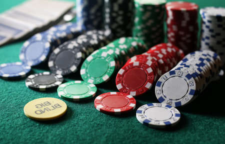 pile of poker chips on a green table close up