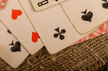 Playing cards on a table covered with coarse cloth. Close-up, selective focus.