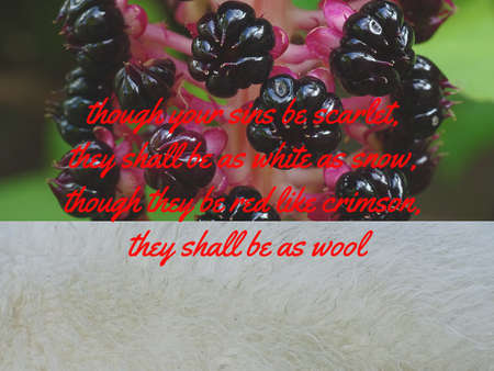 Bible text: though your sins be as scarlet, they shall be as white as snow; though they be red like crimson, they shall be as wool. Text made of a photo of Phytolacca and white wool