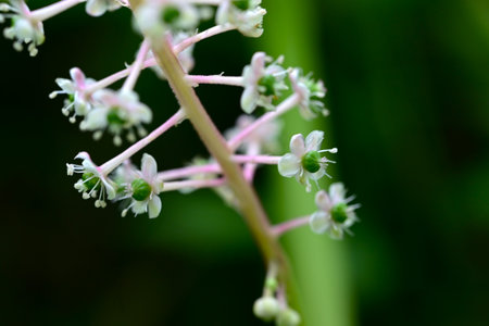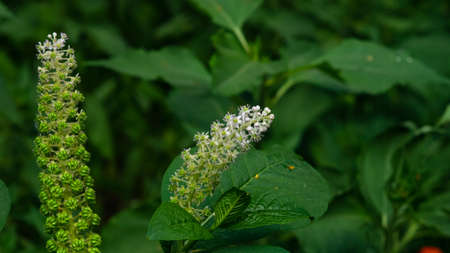 Indian poke or Phytolacca acinosa blossom close-up at flowerbed, selective focus, shallow DOF.