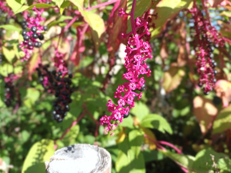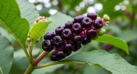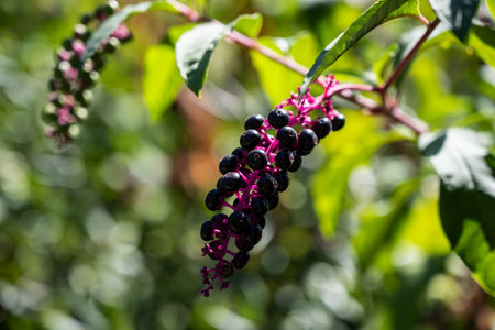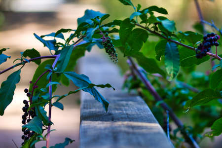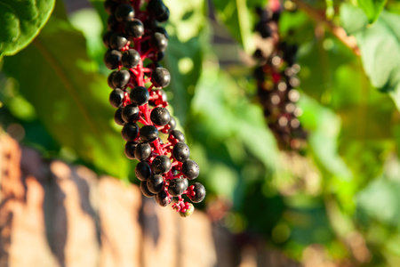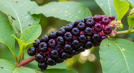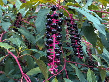 Small black poisonous fruits of Phytolacca plant, also known as pokebush, pokeberry, pokeroot or poke sallet and green leaves in a garden in a sunny autumn day, beautiful outdoor floral background