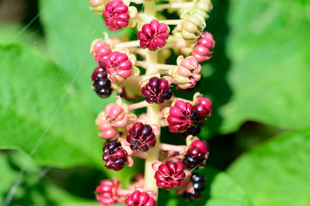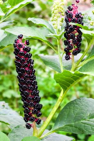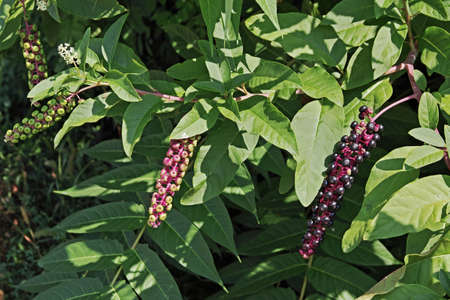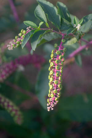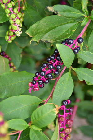 View of pokeweeds phytolacca acinosa foliage and fruit in the summer garden. Macro photography of lively Nature.