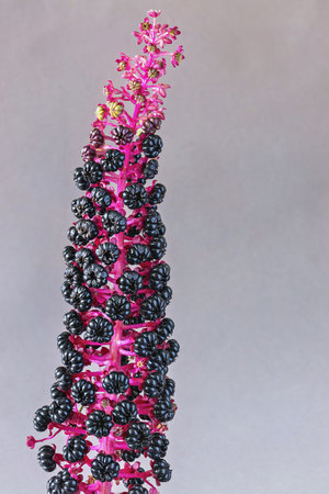 Close-up of a single American sedge, Phytolacca americana, with fruit on a gray background