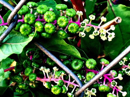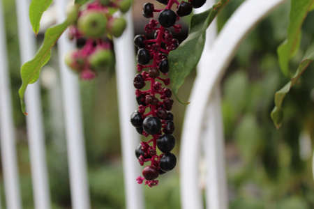 American pokeweed berries. Phytolaccaceae perennial toxic plants.You can see white flowers immature berries and black ripe berries at the same time around September.