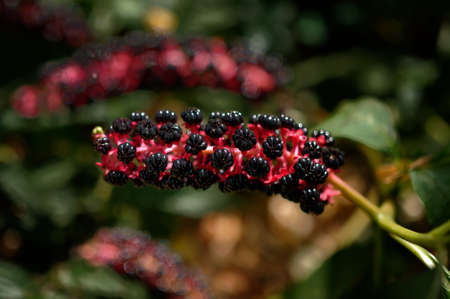 Close-up of Phytolacca americana ripe berries on branches. Pokeweed plant in the garden on late summer