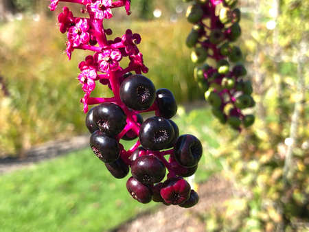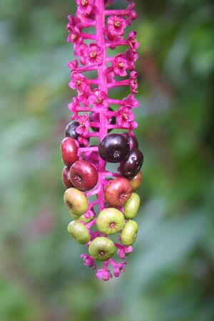 Close-up of Phytolacca americana fruit with purple and pink berries. Pokeweed plant in the garden on autumn season