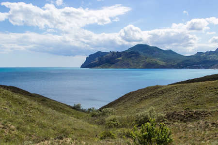 sunset beautiful yellow shore grass coast of bay of Black sea with blue emerald water among hills and high mountains. Crimea, Russia, summer landscape, cape chameleon