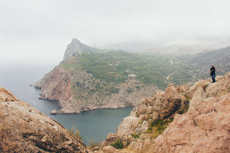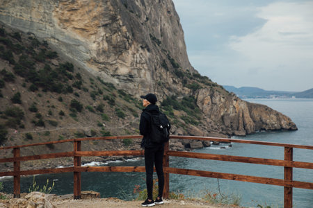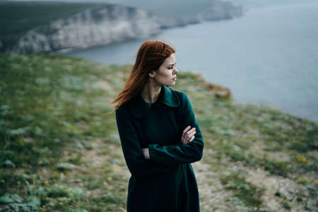 a traveler in a sweater holds her hands near her face on nature in the mountains top view backpack ocean tourism