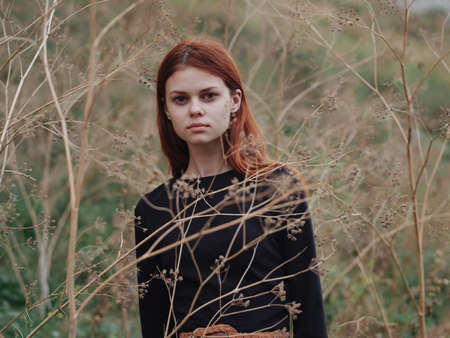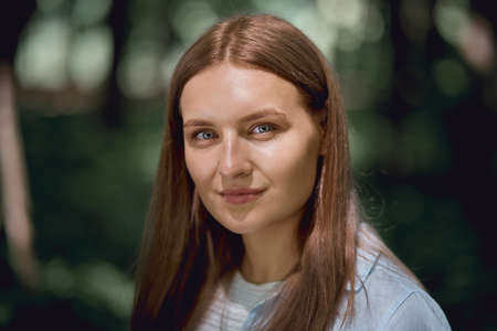 Closeup portrait of attractive girl in casual clothes on green forest background looking into camera with serious face. Pretty tourist girl in gray sweater posing on blurred forest background.