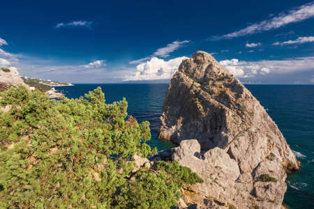 large steep sharp rock cliff with green trees against the background of Black sea beach shore, summer landscape