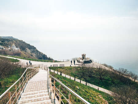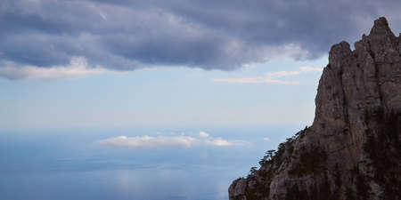 Early morning over the sea from the height of mount AI-Petri. Silvery clouds, Yalta, Ayu-Dag mountain below, coastline. Russia, Crimea