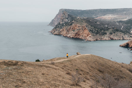 Woman stands on cliff overlooking ocean, cloudy day provides soft lighting. Shes wearing a yellow sweater wearing dark pants. Landscape features rugged terrain, calm waters.
