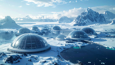 A breathtaking view of a futuristic settlement with advanced biodome habitats nestled in a vast, frozen arctic landscape.