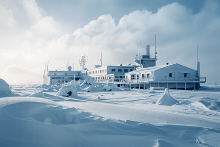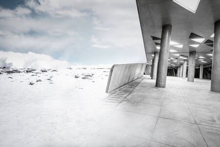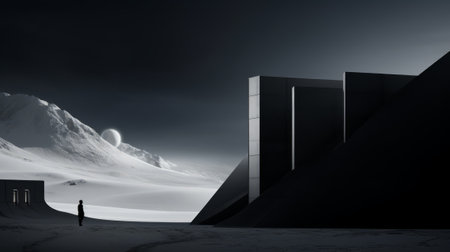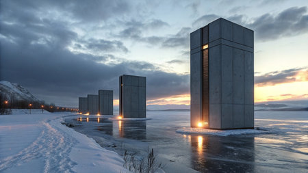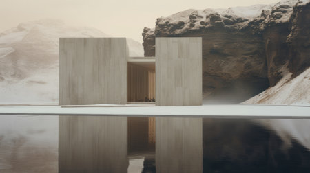 a white structure stands on the edge of a vast lake, creating a striking winter scene. rendered in cinema4d, the design showcases elements of concrete brutalism, with a combination of light bronze and bronze accents. the architecture exudes an organic feel, reminiscent of cinematic sets. this captivating image captures the essence of desertwave and cabincore aesthetics. ai generated