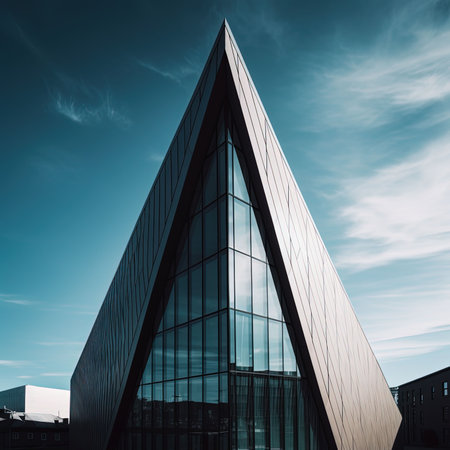Unique triangular structure with sleek lines features expansive glass windows, contrasting with a dramatic cloudy sky, highlighting modern architectural design principles.