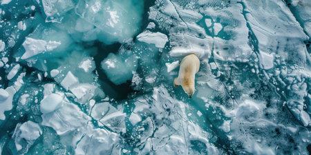 top down aerial shot of polar bear on ice, global warming concept